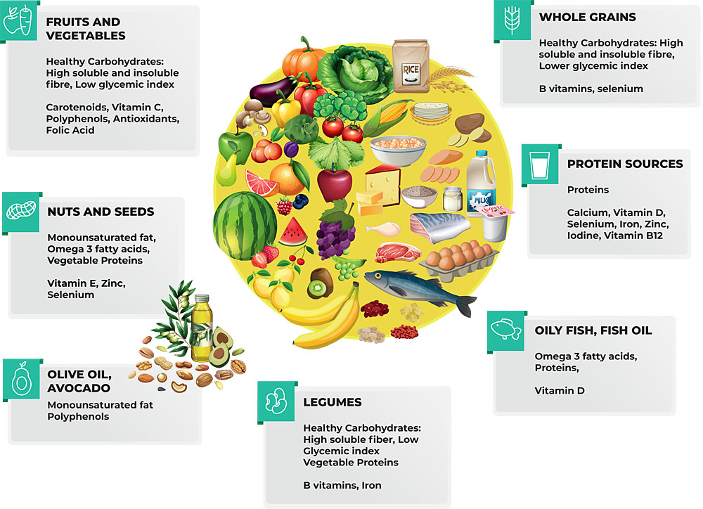 Essential nutrients and bioactive compounds from a healthy diet.