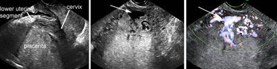 Reference(s):Hasegawa J, Matsuoka R, Ichizuka K, Mimura T, Sekizawa A, Farina A, Okai T. Predisposing factors for massive hemorrhage during Cesarean section in patients with placenta previa. Ultrasound Obstet Gynecol 2009;34(1):80–4. PubMed PMID: 19565529. Yang JI, Lim YK, Kim HS, Chang KH, Lee JP, Ryu HS. Sonographic findings of placental lacunae and the prediction of adherent placenta in women with placenta previa totalis and prior Cesarean section. Ultrasound Obstet Gynecol 2006;28(2):178–82. PubMed PMID: 16858740. Chou MM, Tseng JJ, Hwang JI, Ho ES, Lee YH. Sonographic appearance of tornado blood flow in placenta previa accreta/increta. Ultrasound Obstet Gynecol 2001;17(4):362–3. PubMed PMID: 11339200.