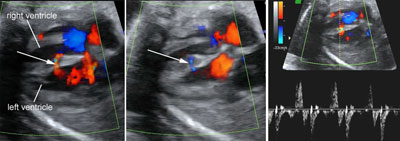 Legend:Color and pulsed Doppler of blood shunting across a muscular ventricular septal defect